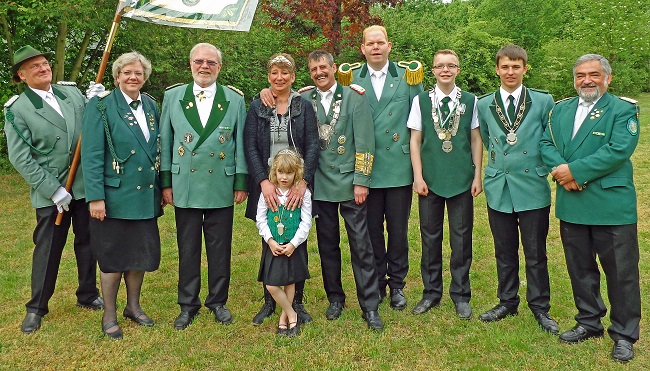 Standartenträger Marco Behrendt, Jungschützenmeister Köln-Flittard / Bezirksschriftführerin Gabi KosziakBezirksbundesmeiste Heinz Josef Faßbender / Bezirksbambiniprinzessin Pia Cirotzki